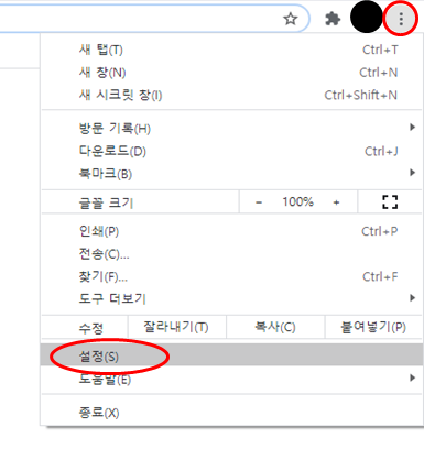 2. 크롬 우측 상단에 보면 점으로 세 개가 표시된 아이콘을 누른 뒤 설정을 눌러 줍니다.