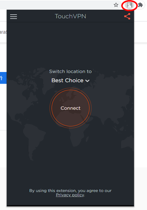 5. 설치가 완료될 경우 우측 상단에 보면 손 모양 표시가 있습니다. 이것이 Browsec VPN 바로가기이며 나온 화면에서 Connet를 눌러 VPN을 시작하여 줍니다.