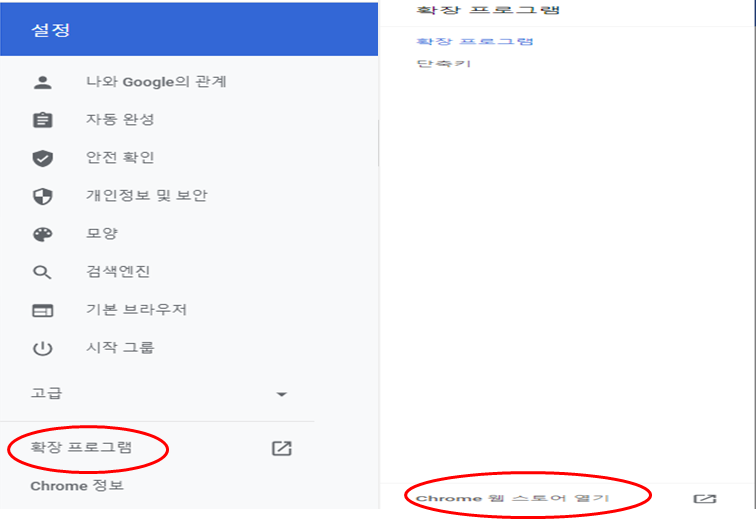 3. 설정 화면의 왼쪽 메뉴에서 확장 프로그램을 누른 뒤 Chrome 웹스토어 열기로 들어갑니다.
