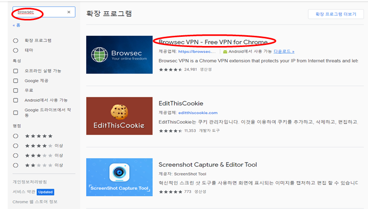 4. 왼쪽 검색창에 browsec이라고 검색한 후 상단에 있는 Browsec Vpn을 눌러 설치하여 줍니다.