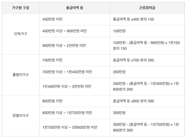 - 홑벌이 가구 : 3,000만 원 미만 (자녀 장려금은 4,000만 원 미만)