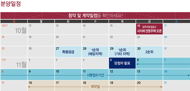 특별공급은 10/27일, 1순위 청약(해당 지역)은 10/28일, 1순위 청약(기타 지역)은 10/29일, 2순위 청약은 10/30일입니다. 그리고 당첨자 발표는 바로 다음 주인 11/5일에 당첨자 발표가 되며 발표 다음날부터 11/14일까지 서류접수를 하는 기간입니다. 그리고 11/16 ~ 11/20일까지 당첨자에 한해 계약을 하게 됩니다.