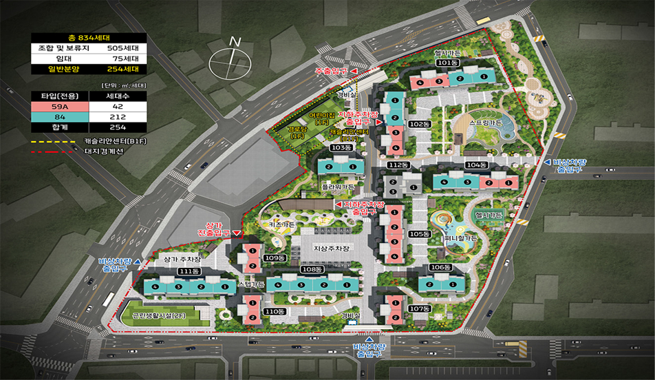 총 834세대의 큰 규모를 가지고 있으며 이중 505세대는 조합 및 보류지, 75세대는 임대주택으로 구성되어 있으며 일반분양은 254세대로 그렇게 많지 않아 아마 경쟁률이 많이 높을 것 같습니다.
