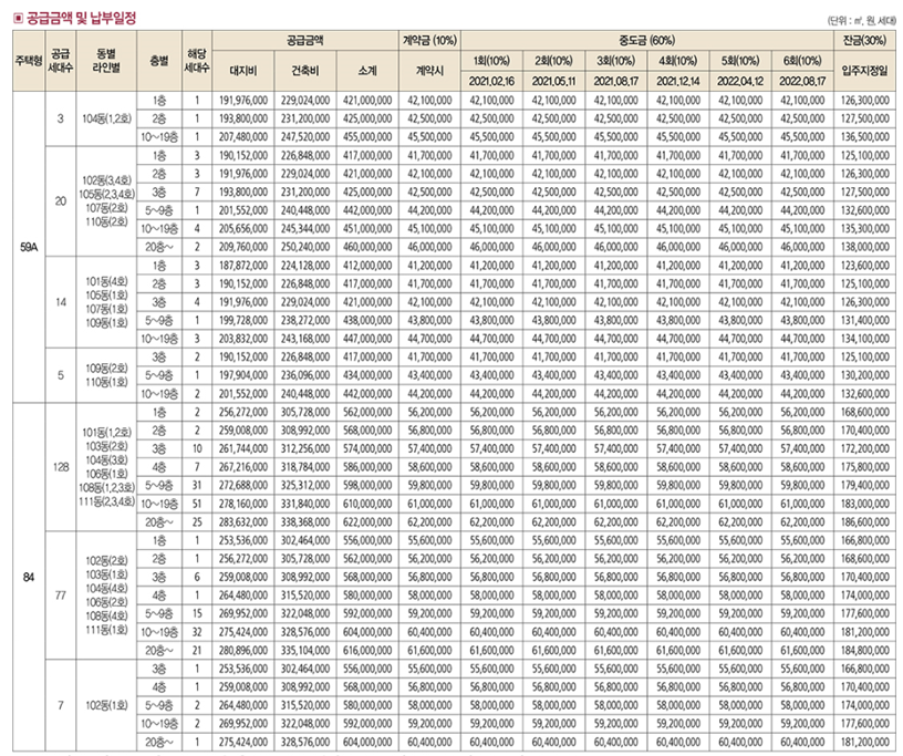 대곡역 롯데캐슬 엘클라씨의 공급금액과 납부일정은 위와 같으며 가장 비싼 분양가는 59A에서는 460,000,000원이며, 84 Type에서 622,000,000원이 가장 분양가가 높습니다.