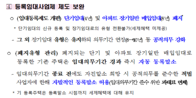 - 단기 임대 및 아파트 장기 일반 매입임대에 대해서 임대사업제가 폐지됩니다. 17년 12월만 하더라도 임대사업자에 등록하면 많은 혜택을 주겠다고 했는데 불과 얼마 지나지 않아서 보완이 되었는데 사실 상 거의 폐지라고 봐야 할 것 같습니다.