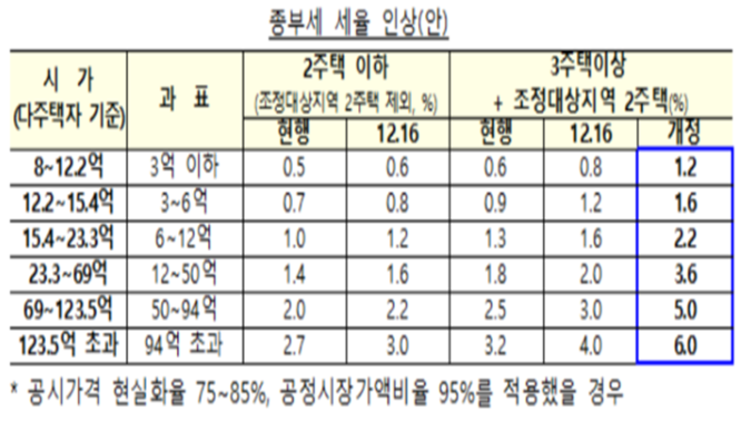 - 3 주택 이상 소유자에 대하여 세율을 인상하였습니다. 기존 0.8 ~ 4%의 비율이 1.2 ~ 6%로 상향되었습니다. 기존 2 주택자 이하에 대해서는 세율 인상 없이 그대로 0.6 ~ 3%의 세율이 유지되었습니다.