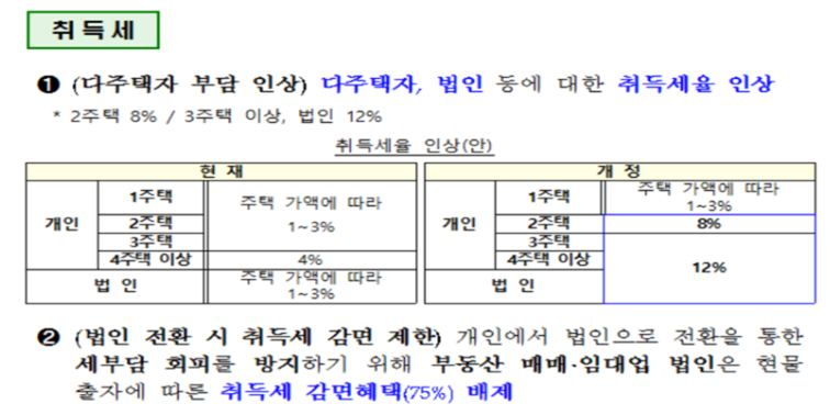 부동산 취득세율이 7.10 부동산 규제 발표에 따라 1 주택의 경우에는 변화가 없지만 2 주택의 경우 1~3% → 8%, 3 주택 이상의 경우 1~4% → 12%로 상향이 되었습니다.