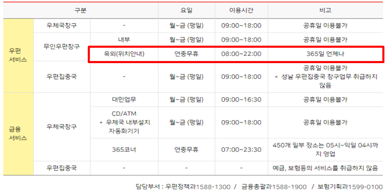 무인우편창구는 연중무휴 오전 8시 ~ 오후 10시까지 365일 언제나 이용 가능합니다. (무인우편창구는 우정사업본부 홈페이지에서 찾을 수 있습니다.)
