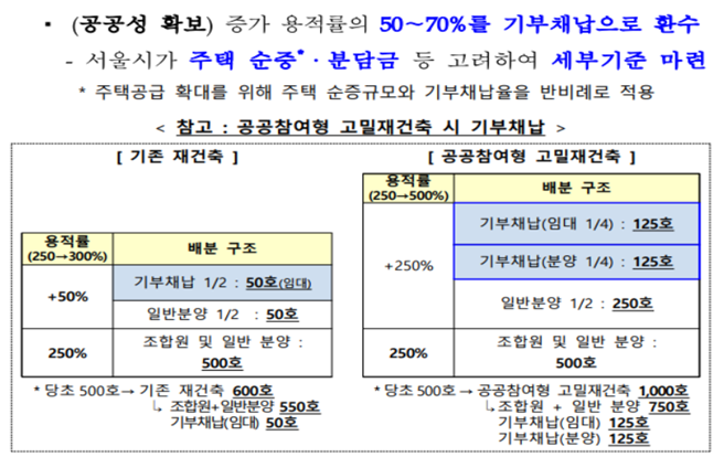 일반적으로 주거지역에서 재건축 용적률은 250%입니다. 이번에 공공참여형 고 밀재 건축을 통해서 50% 늘어나서 300% 하는 조건으로 해오던 관행이 있는데 이것을 정부에서 용인하였습니다.
