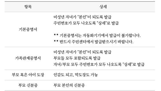 - 필요서류 : 보호자 기준 가족관계 증명서, 아이 기준 기본 증명서 상세분, 보호자 신분증과 도장 (정부 24에서 무료 발급 가능합니다.)