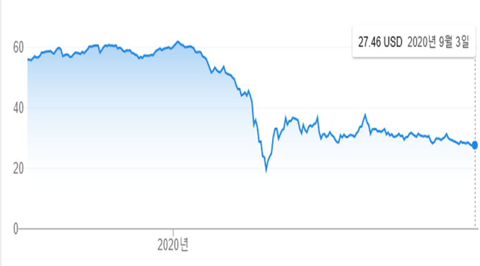 코로나 19 전 최고 $61.9에서 코로나 이후 최저 $19.5까지 폭락을 하였습니다. 이는 코로나 19의 폭락 영향도 있지만 그 당시 미국 와 러시아, 사우디의 원유 감산 전쟁도 한몫하였습니다. 아무래도 정유 주식이다 보니 유가의 영향을 많이 받기 때문입니다.