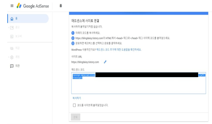 3. 가입을 완료하면 위와 같이 에드센스에서 블로그를 검사(?) 할 수 있는 코드를 줍니다. 그러면 이 코드를 이제 본인 블로그에 붙여 넣으면 됩니다.