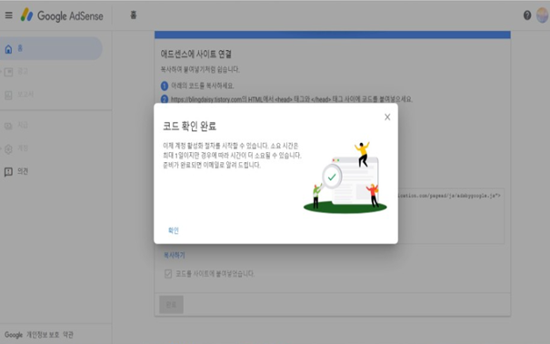 5. 복사한 것을 붙여 넣기까지 완료하면 코드 확인 완료 팝업창이 뜨게 됩니다.